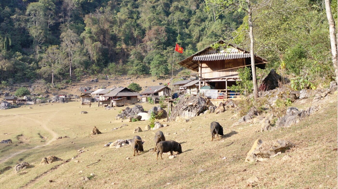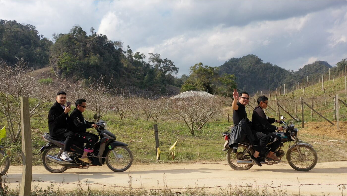 14h00: Chúng tớ di chuyển đi Hang Táu – 1 ngồi làng nguyên thuỷ cách thị trấn Mộc Châu khoảng 21km. Từ thị trấn Mộc Châu đi đến Hang Táu chỉ khoảng 12km là đường đẹp, còn lại là đường khá nhỏ và xấu nên chúng tớ phải đổi xe trung chuyển. Lần 1 đi xe 24 chỗ và 3km cuối là phải đổi sang đi xe máy.